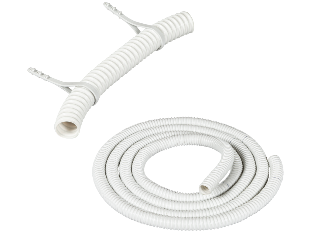 Dräneringskitet innehåller slang, slangklämma och väggfästen för slangen.